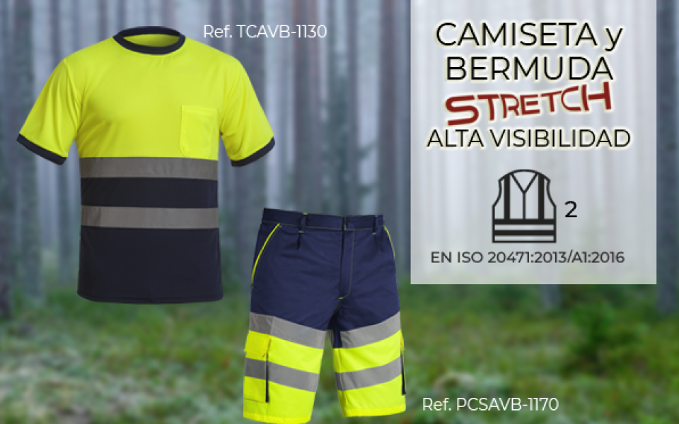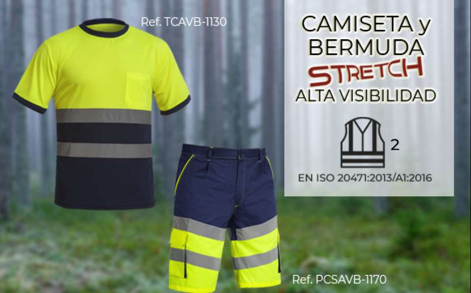 Presentamos el conjunto certificado en EN20471 CLASE 2 del conjunto de nuestra camiseta combi AV y la bermuda STRETCH combi AV.