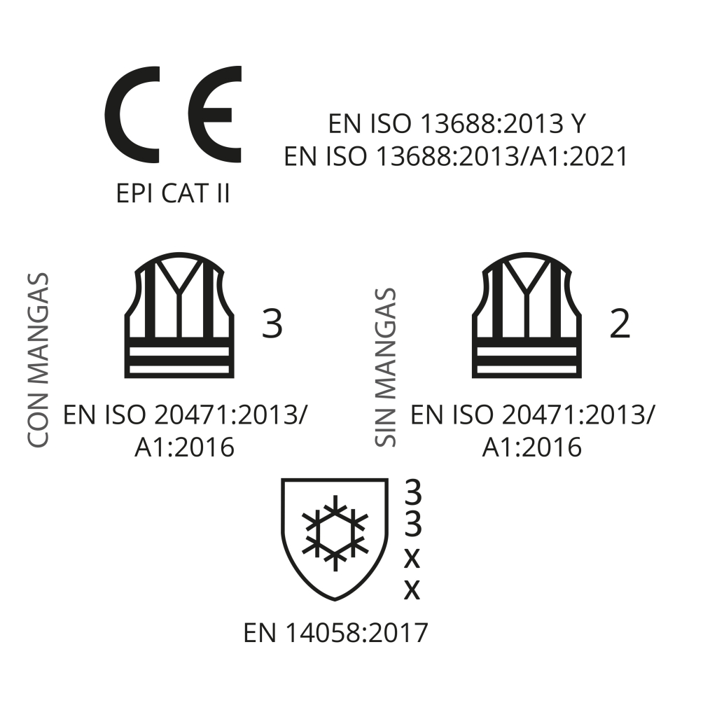 • EN ISO 13688:2013 e EN ISO 13688:2013/A1:2021 (Vestuário de proteção. Requisitos gerais)