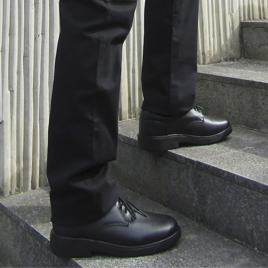 Sapato clerical em pele preta com fecho em renda. Montado, colado e cosido à sola.