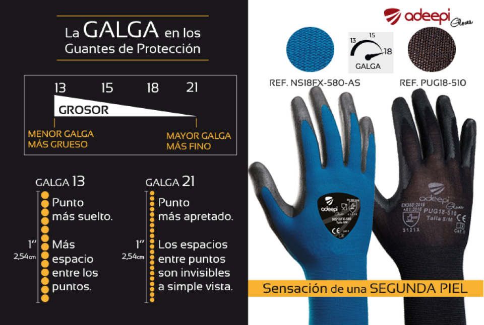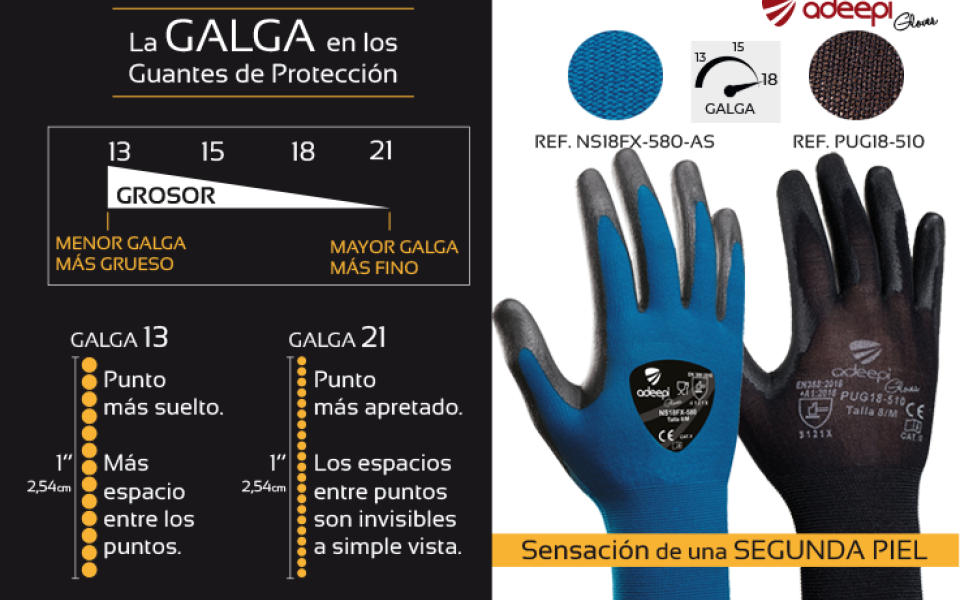 As luvas de proteção variam hoje em dia normalmente entre os calibres 13 e 21. Quanto maior for o calibre, mais fina será a luva, e quanto menor for o calibre, mais espessa e menos desterrada será a luva.